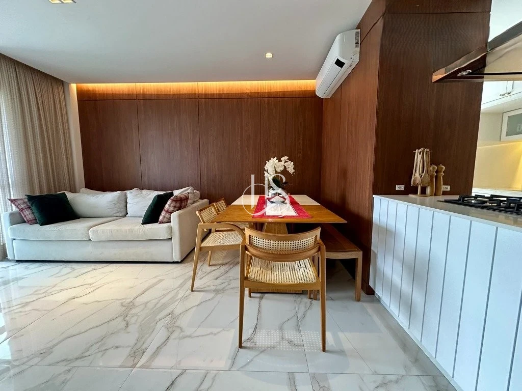 Este imóvel se destaca pelo acabamento de alto padrão e está 100% mobiliado com móveis de qualidade, incluindo persianas integradas nos dormitórios e ar-condicionado para o seu conforto em todas as estações. Além disso, conta com banheiro social e duas vagas de garagem, sendo uma delas especial e parcialmente coberta.