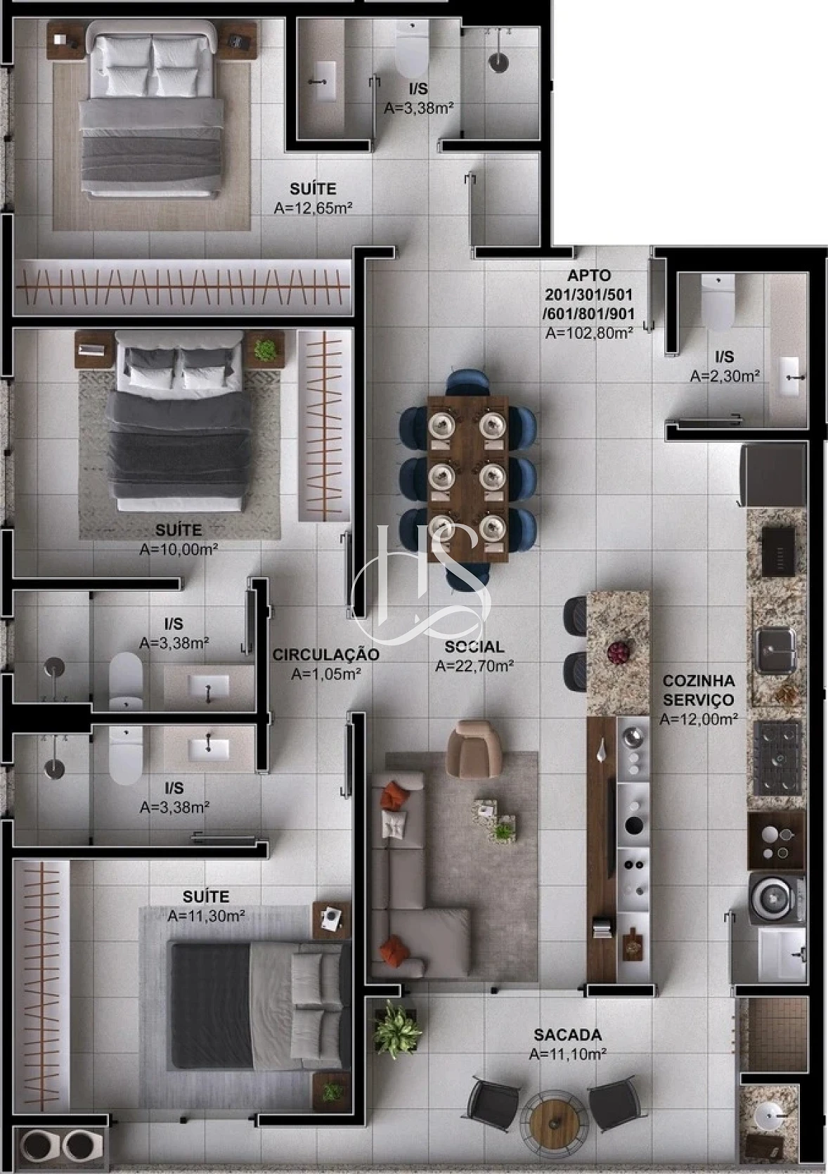 Com 102 m² de puro design, a planta foi projetada para a fluidez. São 3 suítes plenas que garantem a privacidade da família, complementadas por uma área social integrada que convida ao convívio. A sacada com churrasqueira, é o cenário perfeito para o seu happy hour particular, com a brisa da Cidade Criativa como convidada.