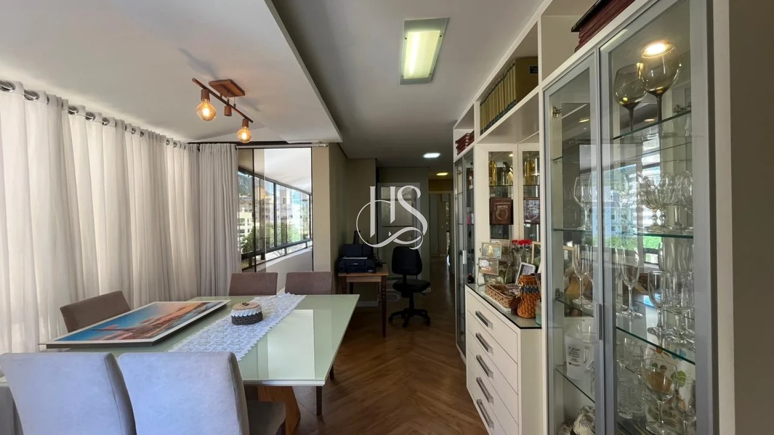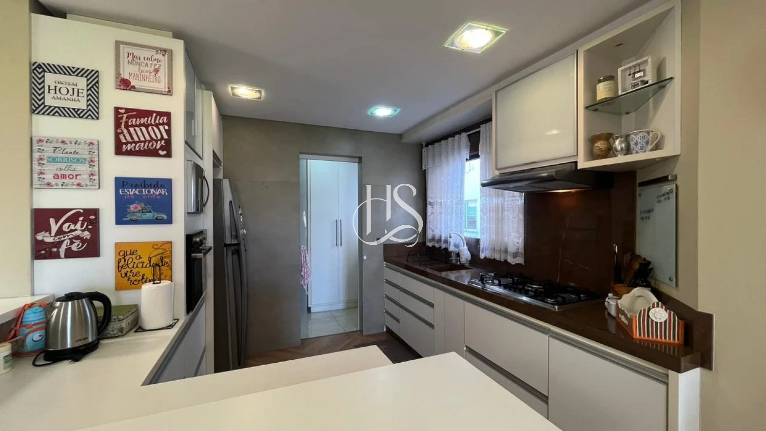 Também permanecem os eletrodomésticos embutidos, mantendo a praticidade e o padrão do projeto, as cortinas e persianas, além da mesa com tampo de vidro e 6 cadeiras, e as 4 banquetas da ilha, deixando o ambiente completo e pronto para uso.