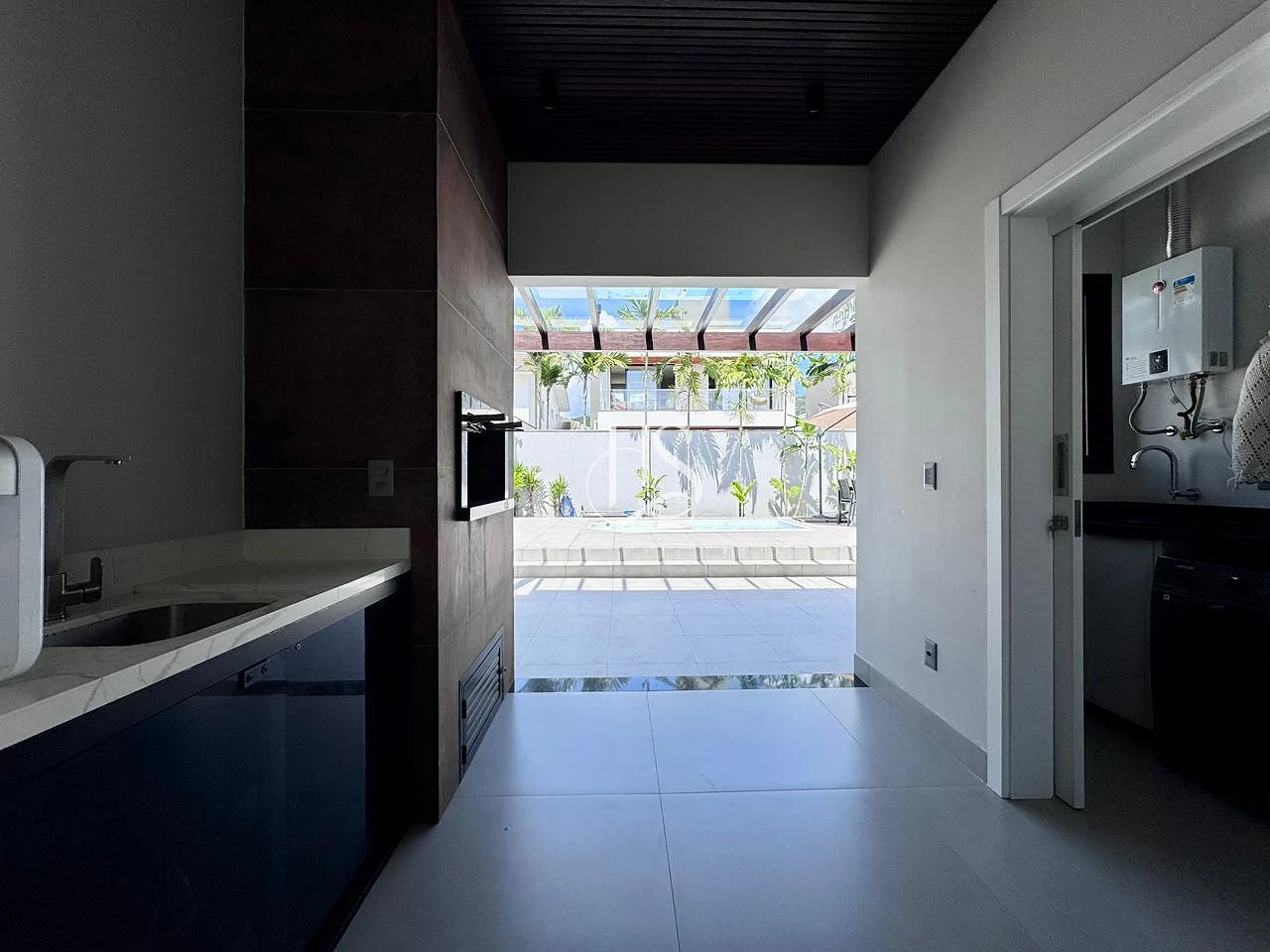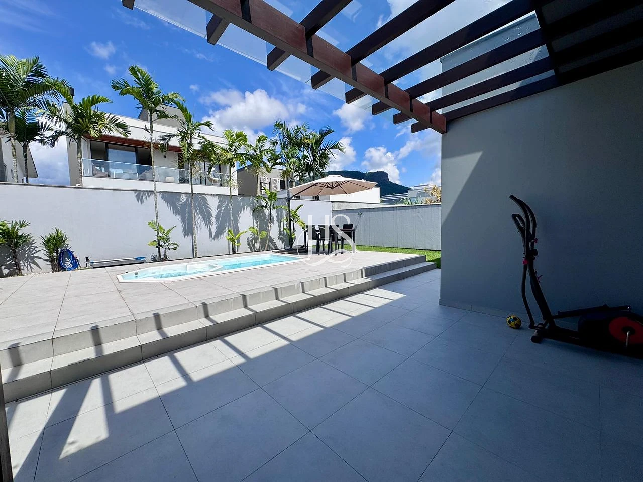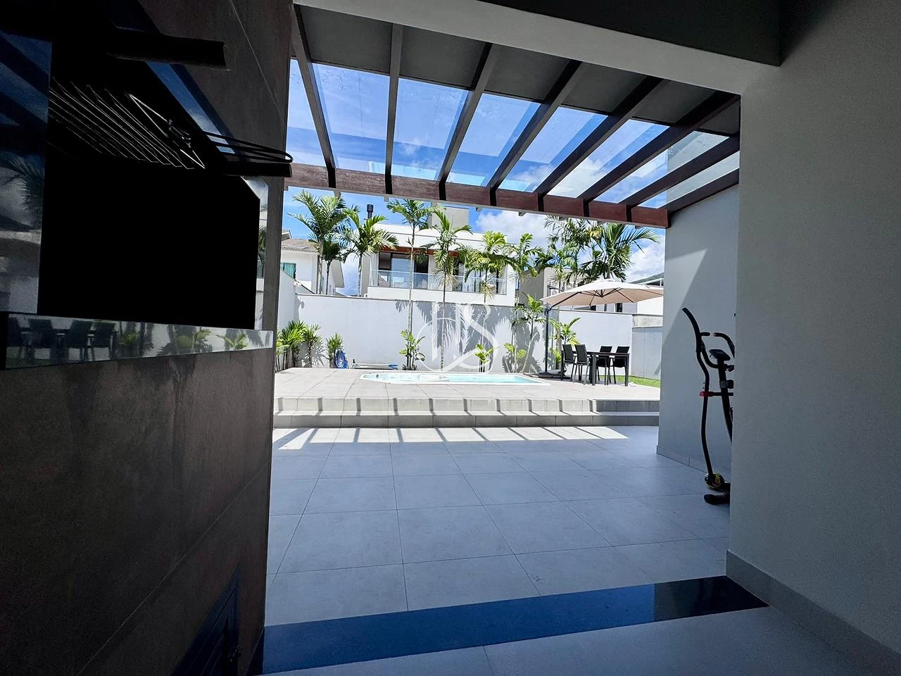 Conforto Extra: O pergolado coberto com vidro amplia a área de convívio, protegendo em qualquer clima.