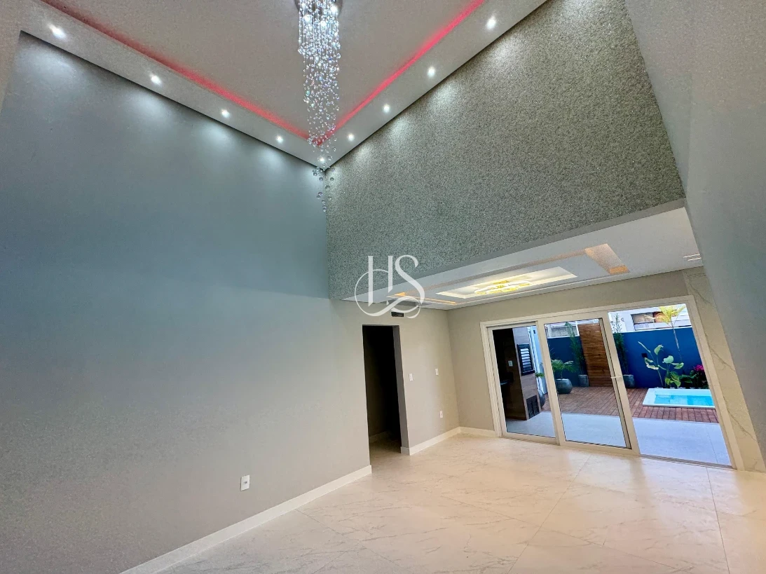 Ao entrar, a imponência do pé-direito duplo e o lustre deslumbrante te dão as boas-vindas, banhando os ambientes com luz natural e criando uma atmosfera grandiosa. O acabamento de altíssimo padrão é visível em cada detalhe, com a elegância do porcelanato que cobre toda a casa e o gesso em todos os cômodos, adicionando um toque de requinte.