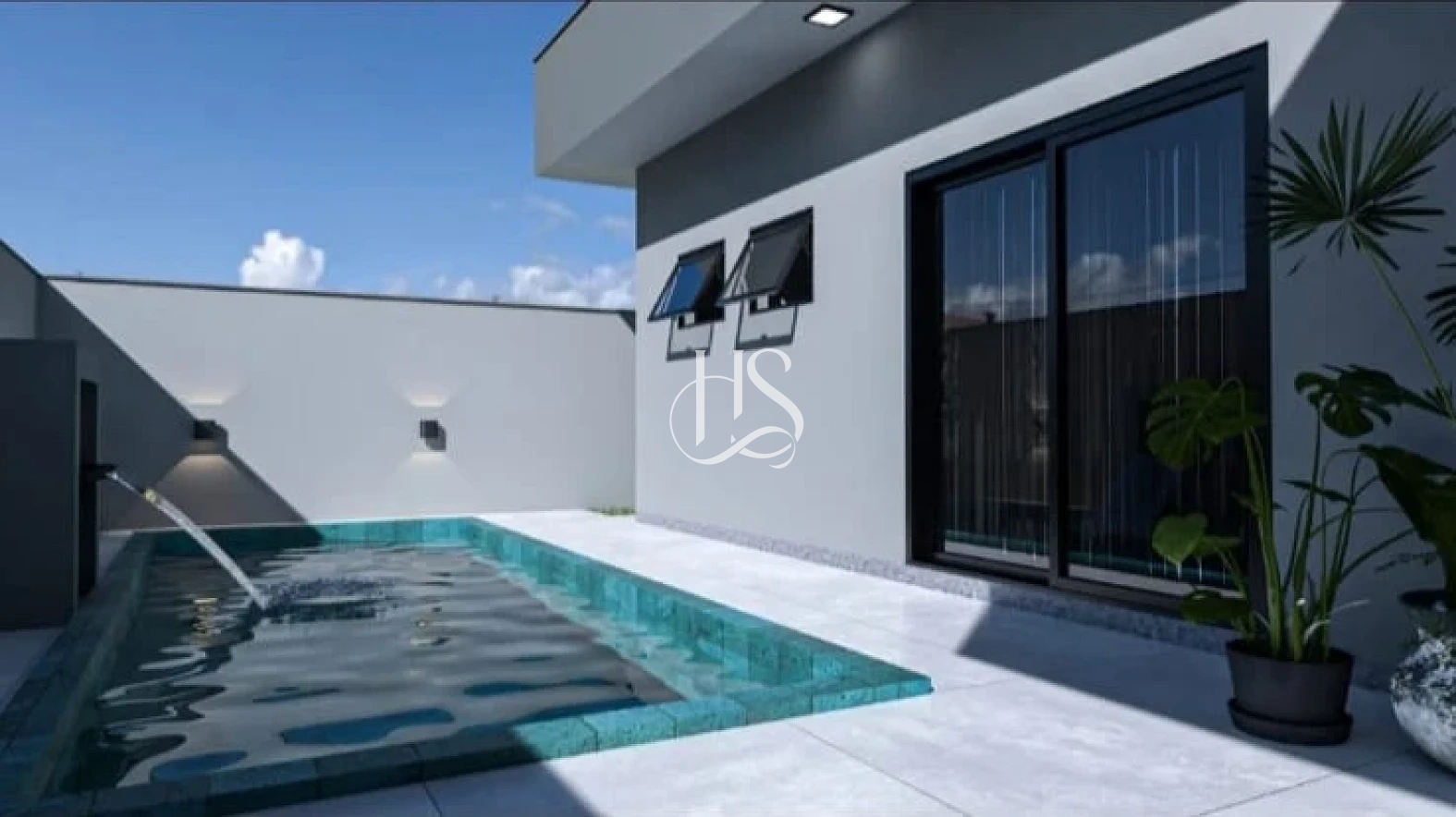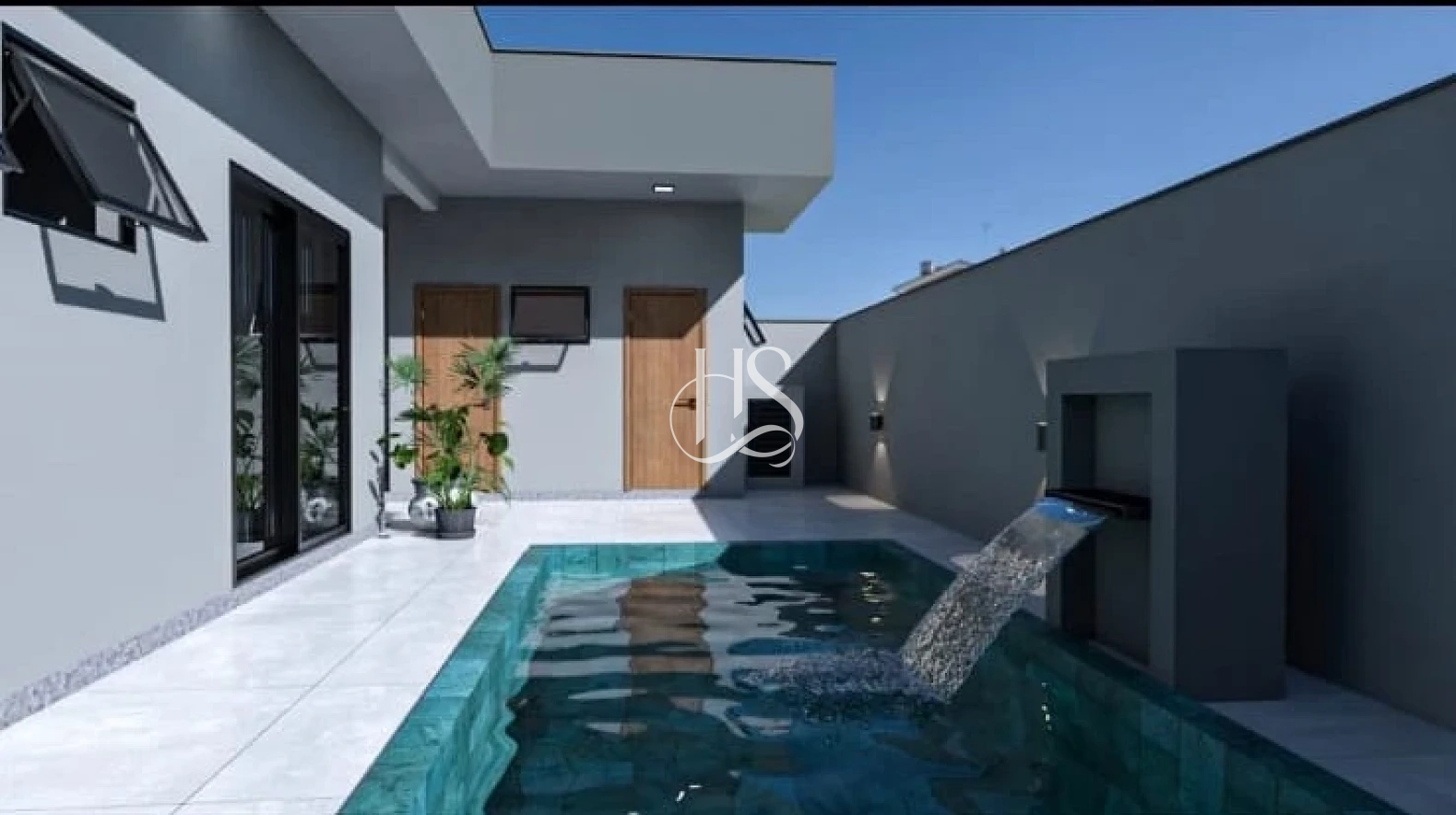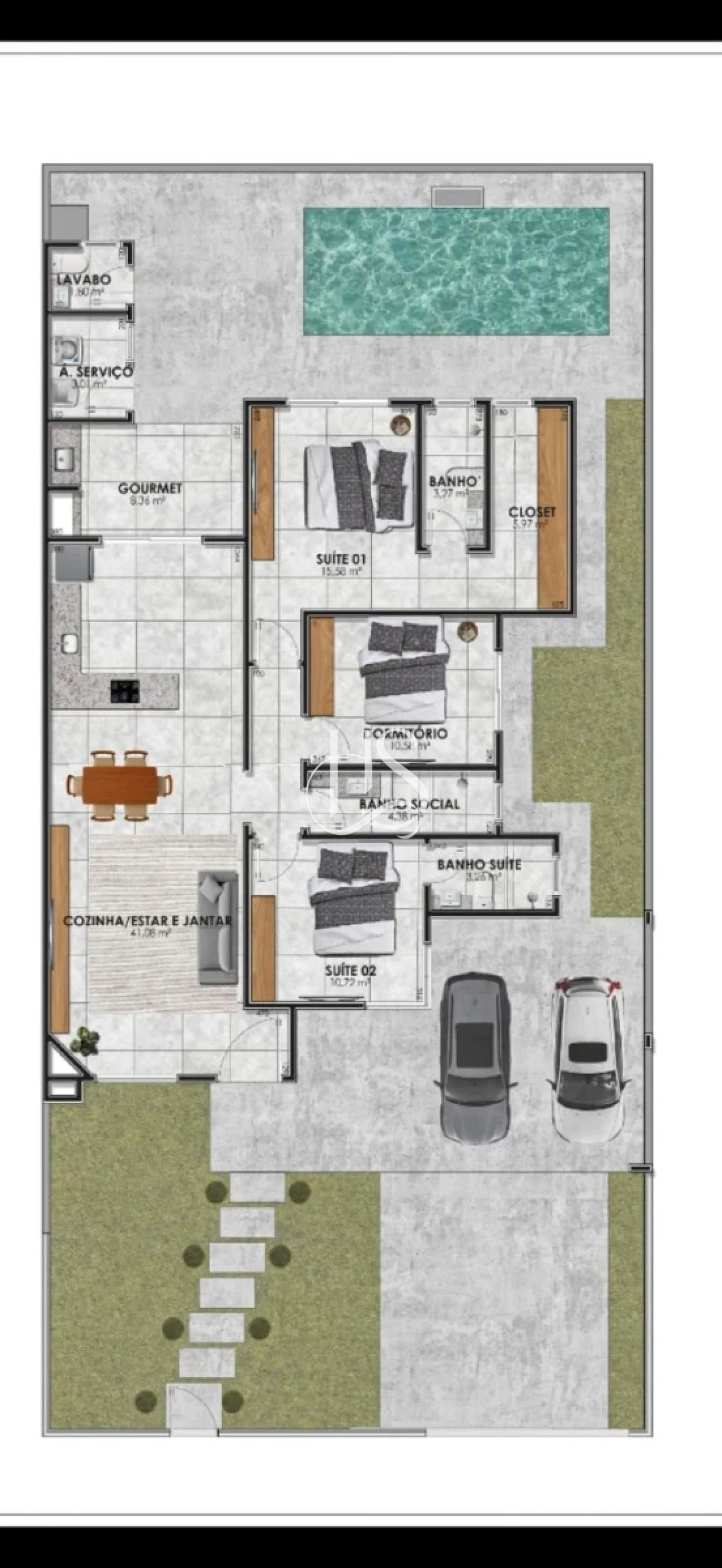 A área externa convida ao relaxamento, piscina com cascata e paisagismo planejado, que complementa a proposta contemporânea do imóvel. A garagem é ampla, com portão automatizado, o projeto ainda contempla pergolado metálico, lavabo, banheiro social e área de serviço independente.