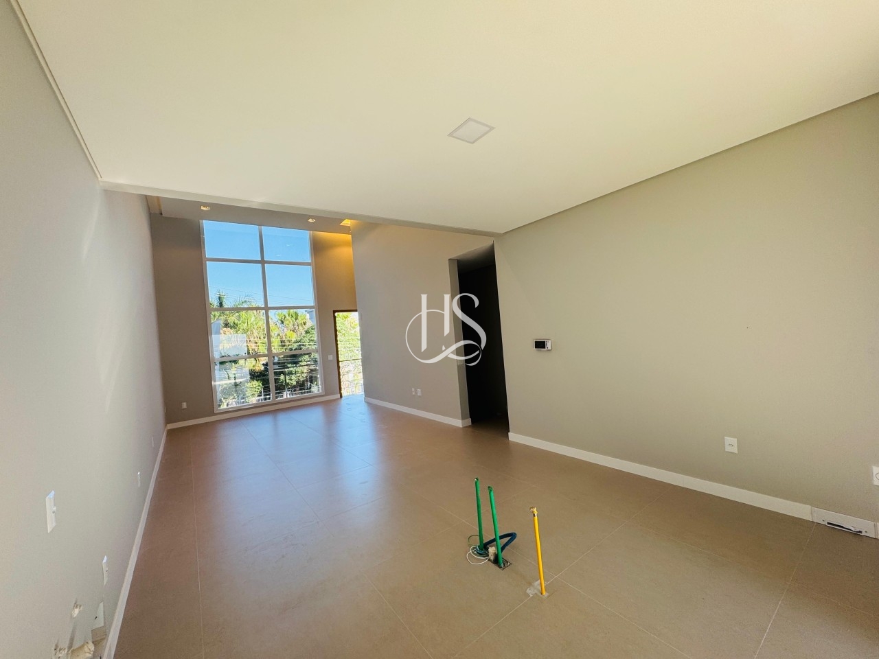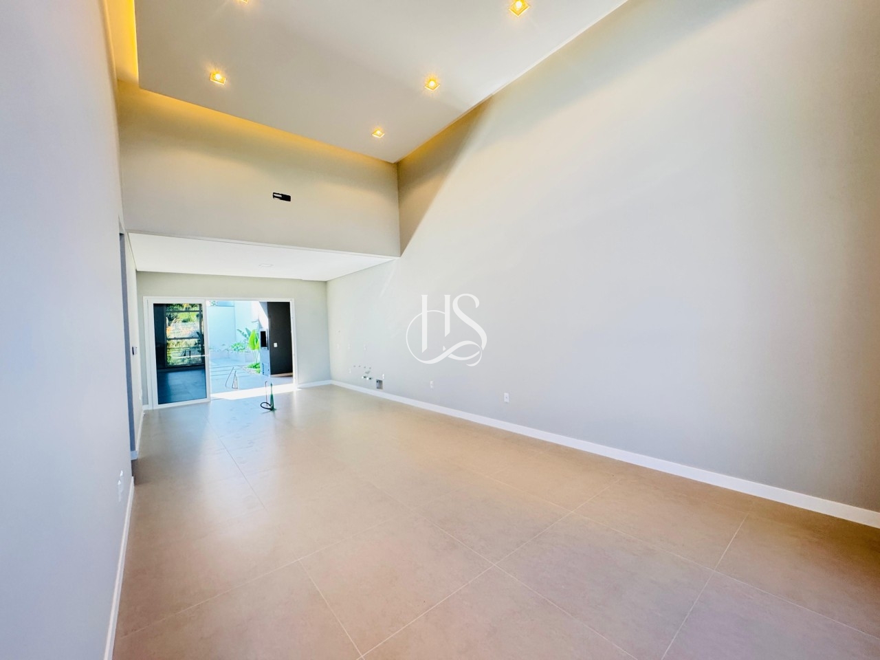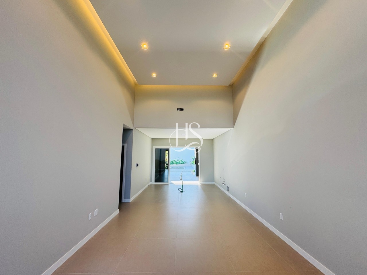 Pé-direito duplo na sala, realçado por detalhes em LED.