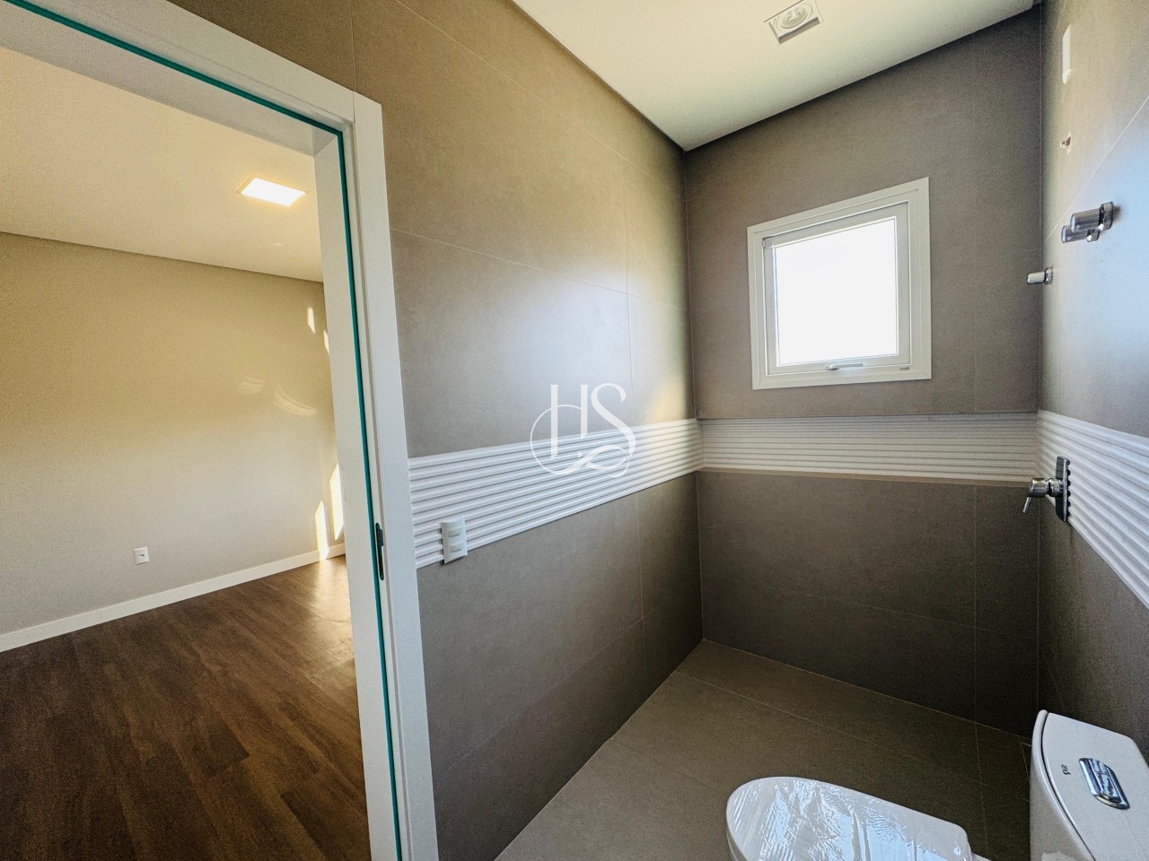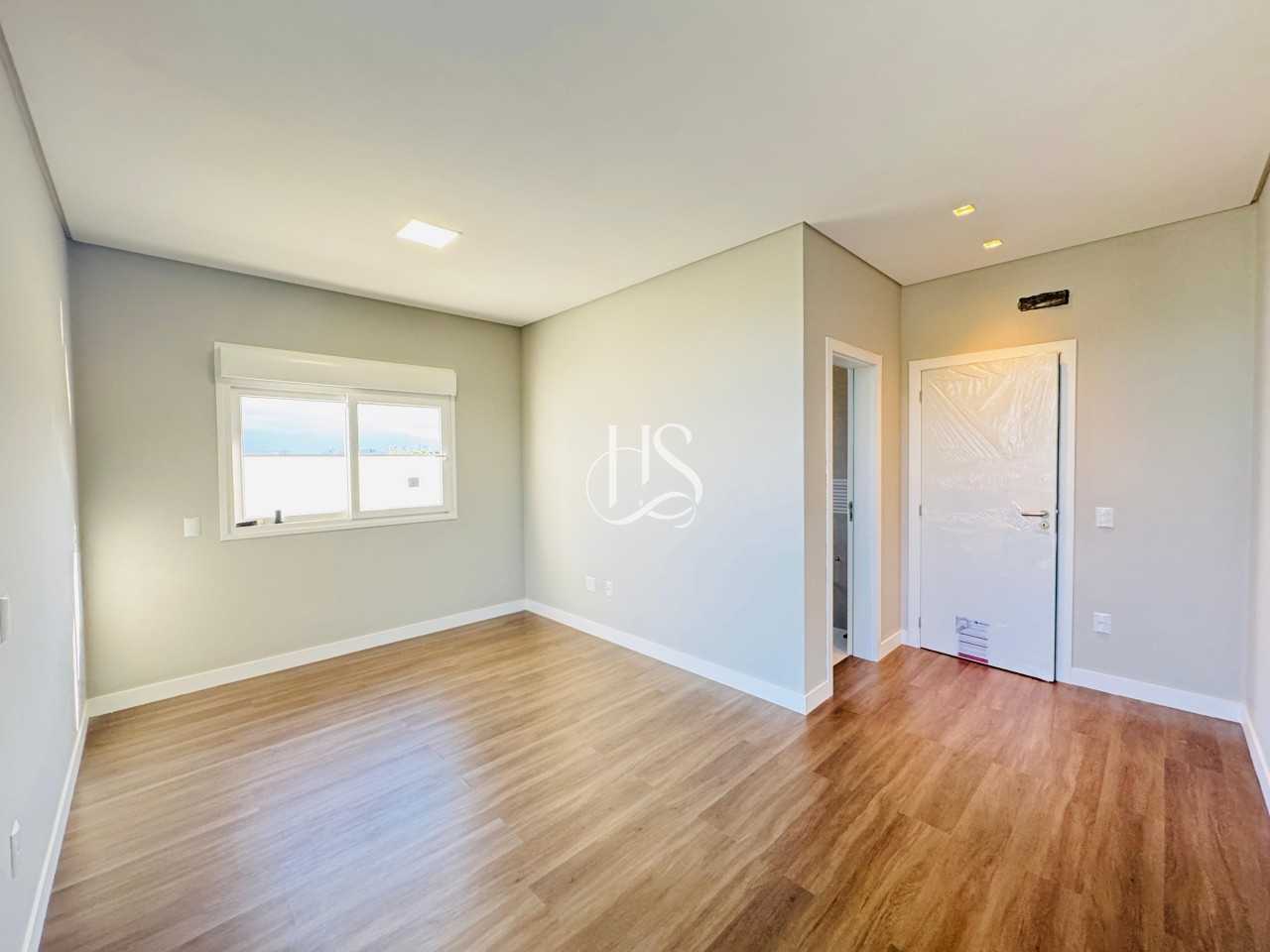 Piso porcelanato nas áreas sociais e vinílico nos quartos.